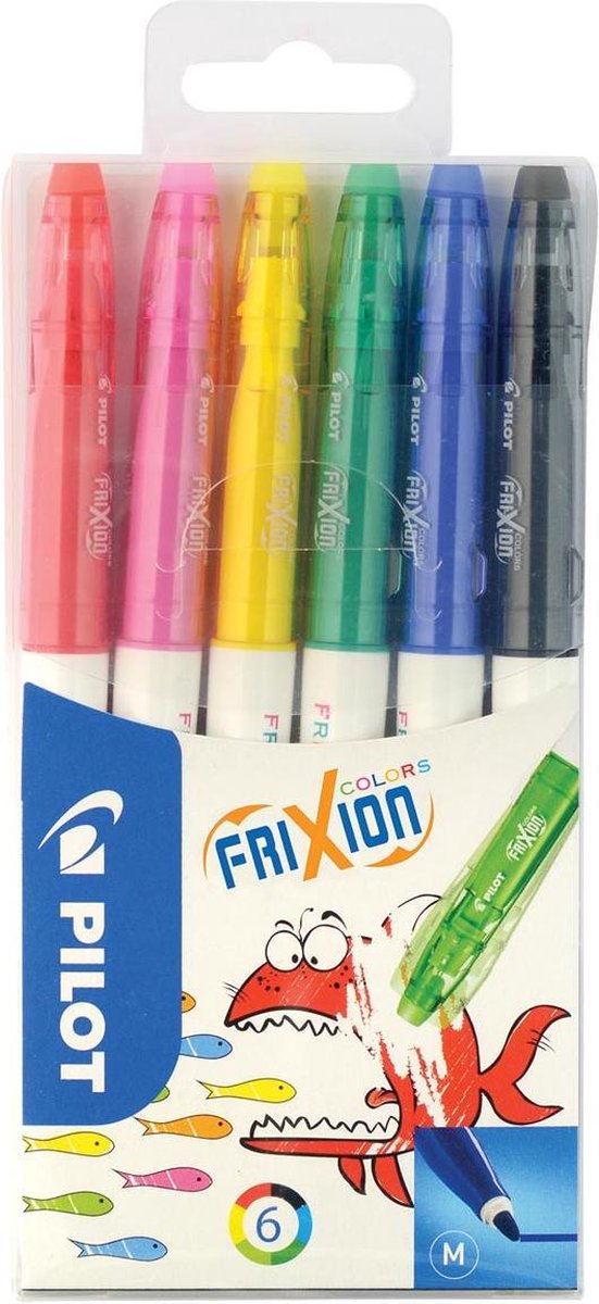 Heldere kleuren. Uitwisbare inkt: kleur, wis met de achterkant van de stift en kleur opnieuw. Wis zonder het papier te beschadigen. Niet geschikt voor kinderen onder de 3 jaar. In een plastic etui.\\n\\n6 stiften