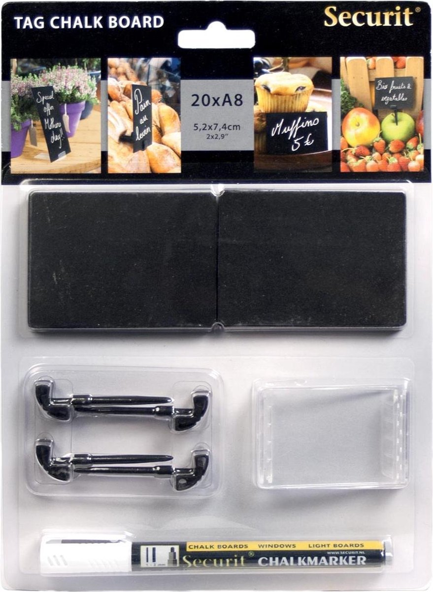 Krijtbordje om als prijskaartje te gebruiken. Dubbelzijdig, flexibel en makkelijk schoon te maken. Set van 20 stuks inclusief 1 krijtmarker, 4 prikkers en 2 houders. Op blister.\\n\\nft A8