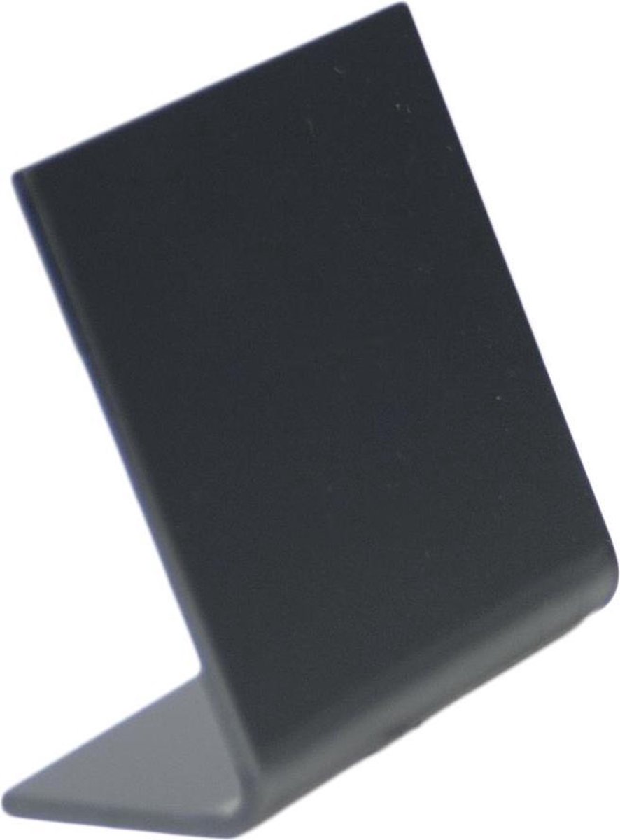 Tafelmodel. L-vormig. Uit robuust en stevig acryl. Mat aan de voorkant, glanzend aan de achterkant. Kleur: zwart. Op blister.\\n\\nft A8, 5 stuks