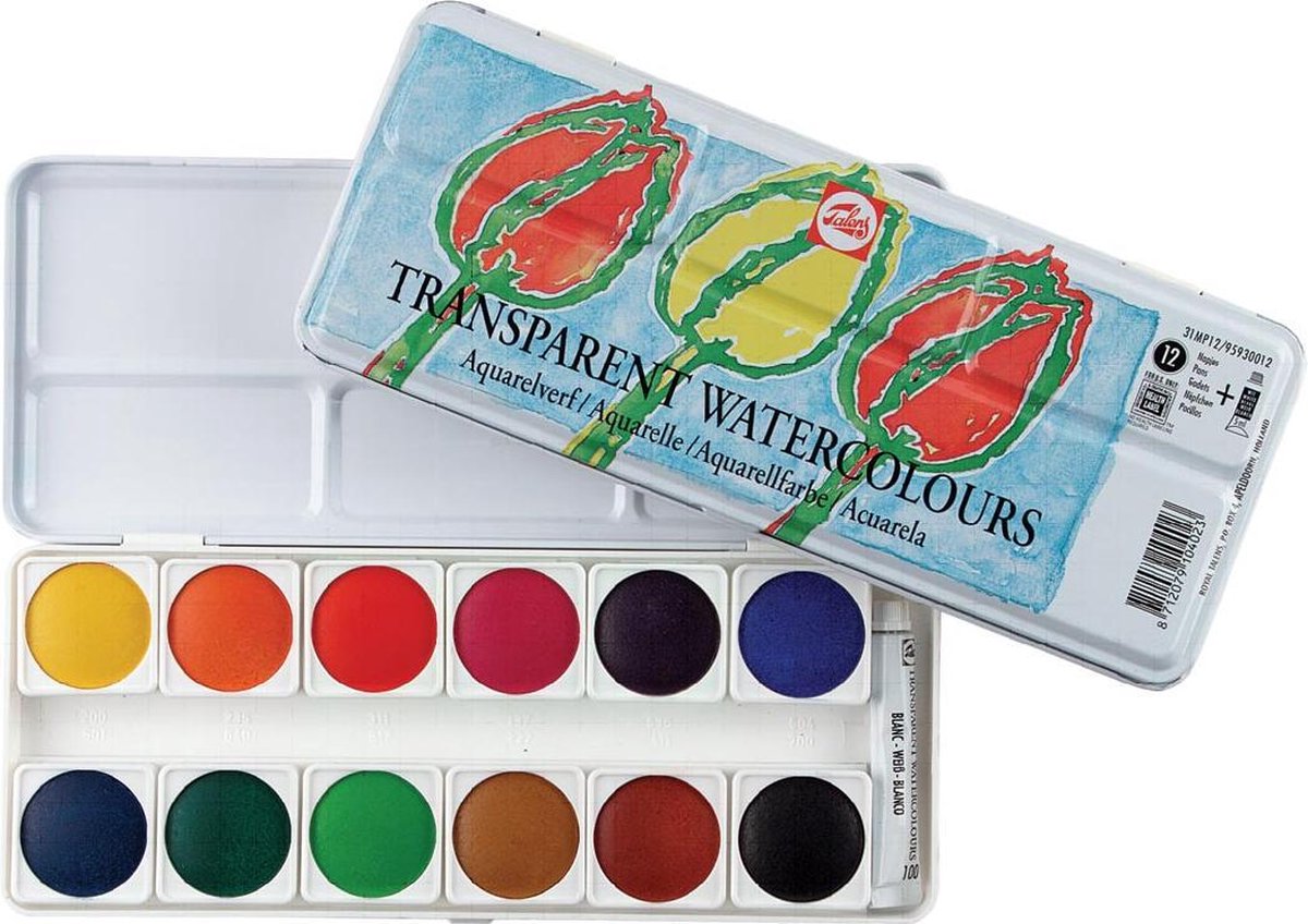Voor gebruik op school en thuis. Metalen doos met een plastic mengdeksel. Met tube mengwit. Napjes van 30 mm.\\n\\n12 napjes