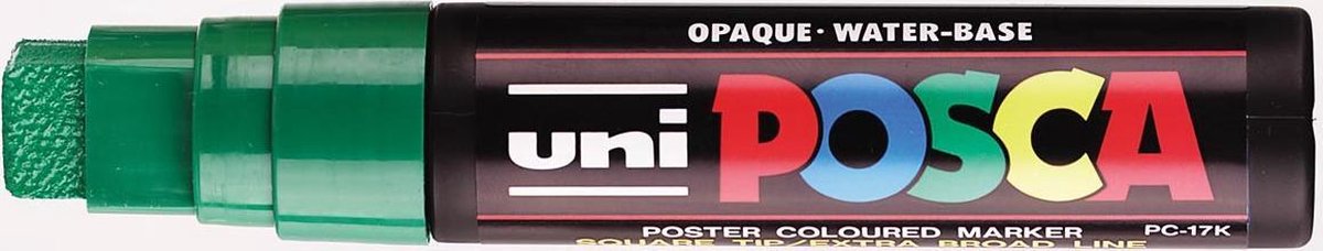 Merkstift op waterbasis en gepigmenteerde inkt. Schrijfbreedte: 15 mm. Ideaal om te schilderen, tekenen, schrijven en markeren op elk oppervlak. Met ondoorlatende, heldere kleuren. Dekkend, overschrijfbaar, mengbaar, waterbestendig, constant bij langdurigeblootstelling aan licht en reukloos. Geschikt voor alle ondergronden. Permanent op poreuze oppervlakken.\\n\\ngroen