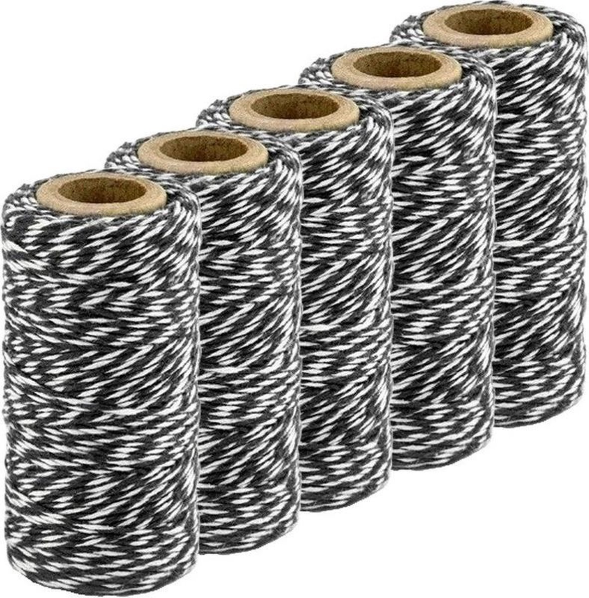 5x Zwart/wit bakkerstouw 50 meter hobby materiaal. Een rolletje met zwart/wit touw. Het zwarte/wittw touw is ook wel bekend als bakkerstouw, baktouw, slagerstouw, bindtouw of keukentouw. Materiaal touw: 100% katoen, kokertje: karton. Toepassing: cadeautjes verpakken, geschenken inpakken, traktaties maken. Bakers twine hobbymateriaal cadeauverpakkingen cadeaulint. U ontvangt 5 rolletjes met op elk rolletje 50 meter touw.