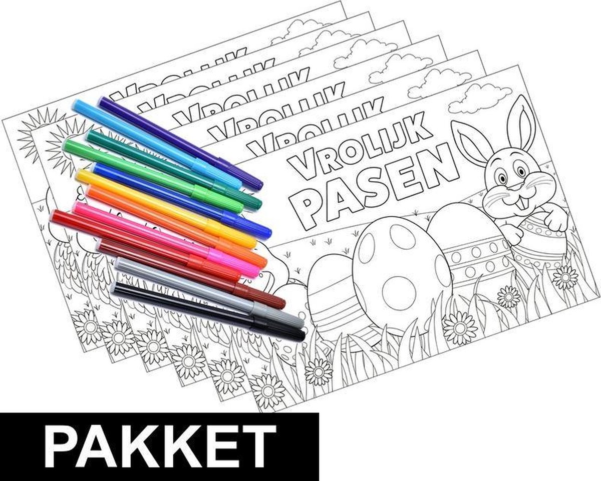 Dit pakket bevat 6 papieren kleurplaten voor Pasen, die tevens als placemat gebruikt kunnen worden van ongeveer 42 x 30 cm en een viltstiften set - 24 delig. bestaande uit 1x Viltstiften set 24-delig, 1x Papieren Paas kleurplaat placemats 6 stuks