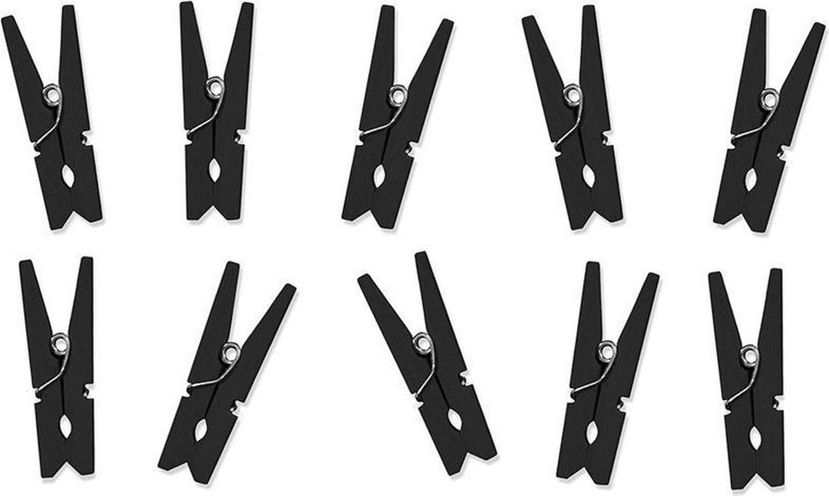 60x Zwarte mini knijpertjes. 6 Zakjes met 10 zwarte mini knijpertjes. Leuk om kaartjes mee op te hangen, om een presentje in zakje mee te versieren of om zelf te decoreren. Materiaal: hout, metaal. Formaat: 3,5 cm lang.