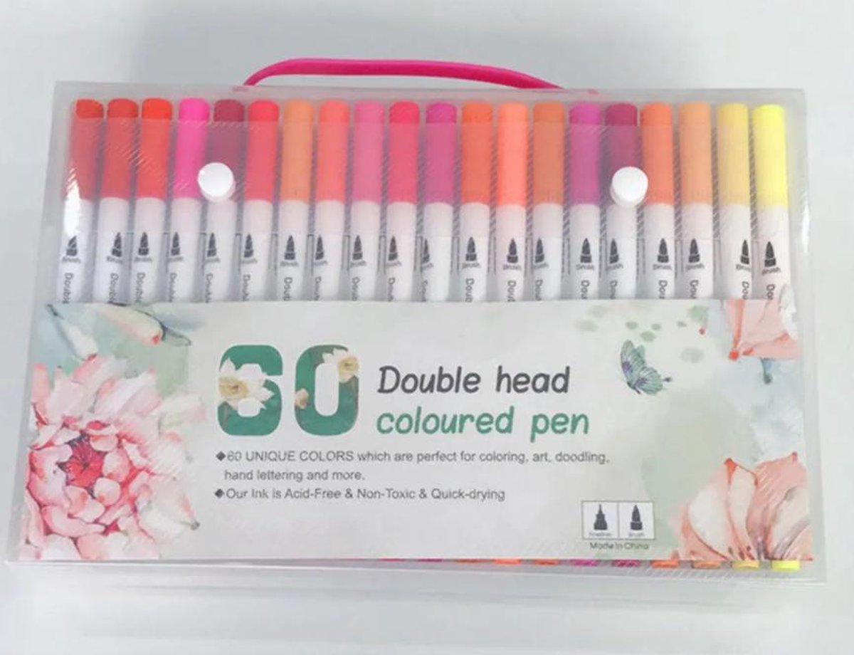 Materiaal: kunststof, inkt op waterbasis Lengte: 15,9cm Tweekoppige markeerstiften. Dubbele tips: Soft penseelpunt voor schaduwen en kleuren; Fijne punt van 0,4 mm voor overzicht en detail. Zuurvrij, niet giftig, geurloos. Het werkt als een penseel om fijne, medium of vette streken te maken, ideaal voor belettering. Comfortabel om vast te houden, soepel schrijven. Voor beeldende kunst, illustraties Perfect voor kunstenaars, studenten, kinderen en meer voor kunst en ambachten, schets etc. tweekoppige markeerstiftenset