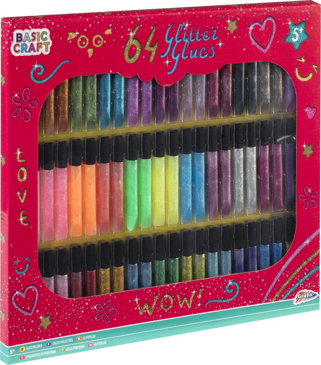 64x Hobby/knutsel glitter lijm stiften. Set van 64x stiften met glitterlijm in verschillende kleuren. Het formaat van de stiftjes per stuk zijn ca. 10,5 cm in hoogte en 1 cm in diameter. Knutsellijm/hobbylijm met glitters. Creatief speelgoed hobby/knutselmateriaal voor kinderen.