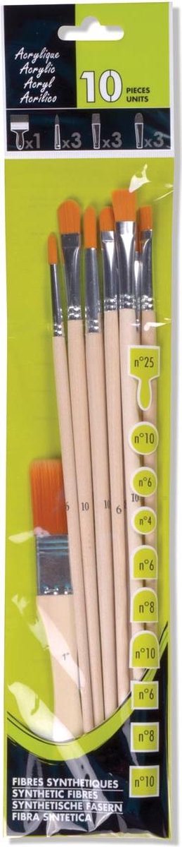 Synthetische vezels. Set van 10 acrylverpenselen. Inhoud: 1 kwast nr 25, 3 ronde penselen, 3 platte penselen en 3 kattentongpenselen.