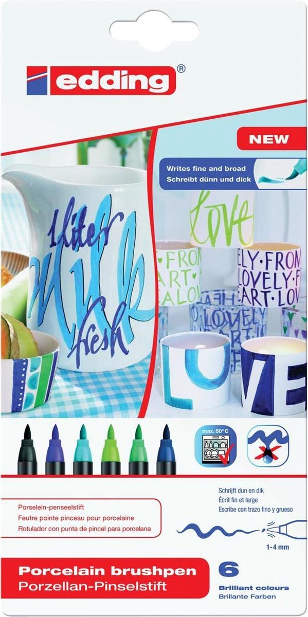 Viltstift met flexibele penseelpunt voor porselein, geglazuurd keramiek en ovenvast glas. Na inbranden ook vaatwasmachinebestendig. Geen vorming van lopers of druppels. Sneldrogend en corrigeerbaar tot voor het inbranden. Uiterst lichtechte pigmentinkt opwaterbasis. 6 stuks in een kartonnen etui.\\n\\nkoele kleuren: zwart, violet, lichtblauw, lichtgroen, turkoois en staalblauw