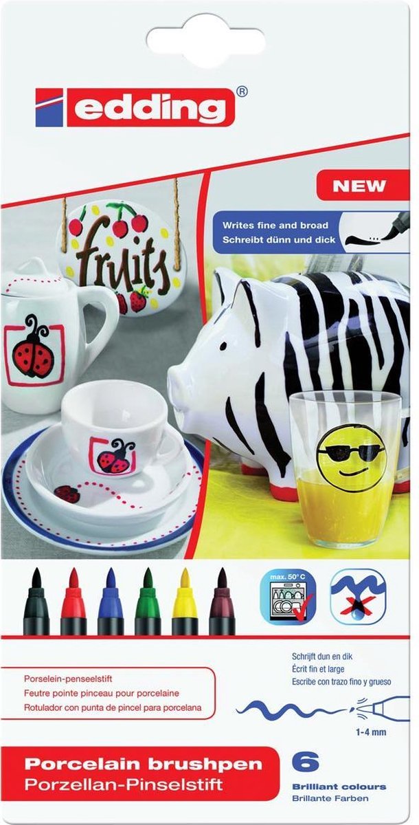Viltstift met flexibele penseelpunt voor porselein, geglazuurd keramiek en ovenvast glas. Na inbranden ook vaatwasmachinebestendig. Geen vorming van lopers of druppels. Sneldrogend en corrigeerbaar tot voor het inbranden. Uiterst lichtechte pigmentinkt opwaterbasis. 6 stuks in een kartonnen etui.\\n\\nfamily colours: zwart, rood, blauw, groen, geel en bruin