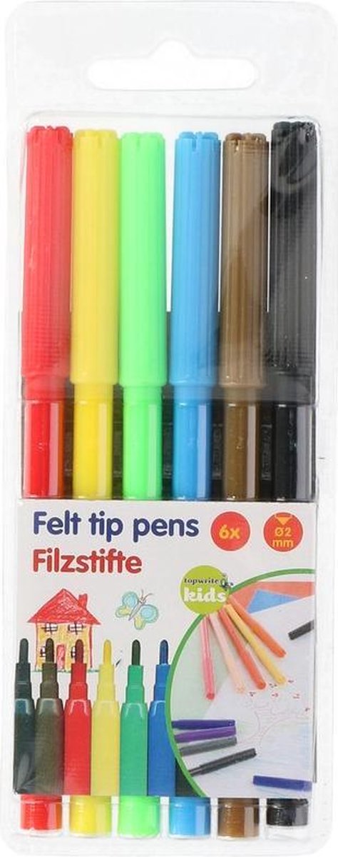 Een set van 6 gekleurde viltstiften met dunne punt. De stiften worden geleverd in een etui. Hoogte stift: ca. 15 cm. Eventuele stiftvlekken zijn te verwijderen bij 40 graden wassen.