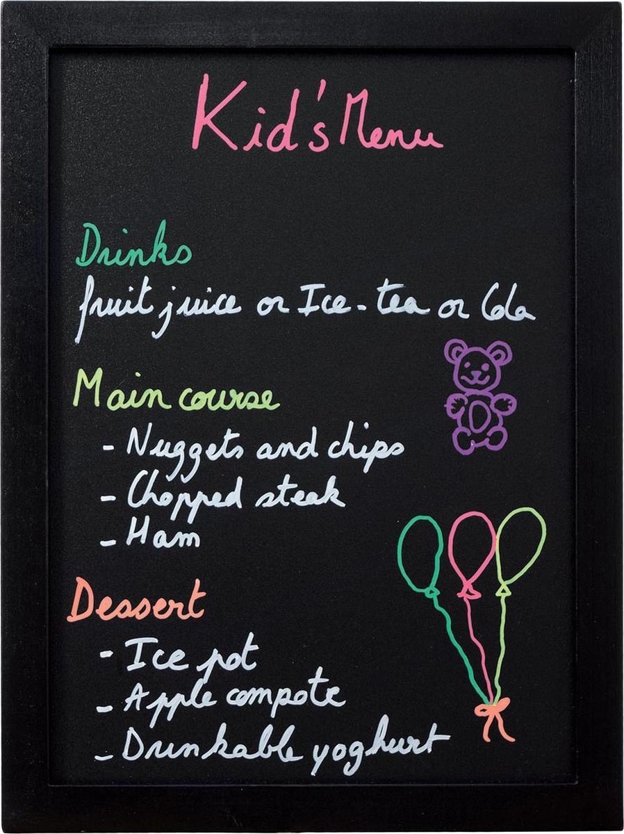 Muurmodel. Budgetvriendelijk krijtbord. Krijtbord met een houten frame en dubbelzijdig schrijfoppervlak. Geleverd met 1 krijtmarker.\\n\\nft 30 x 40 cm, zwart