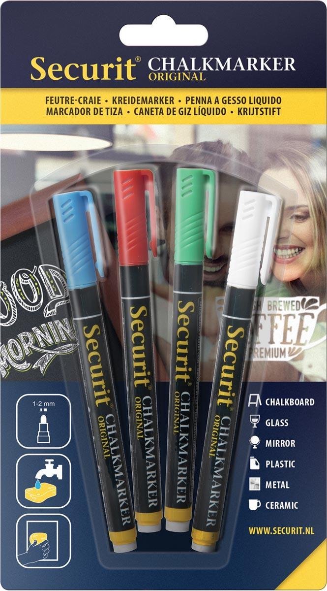 Fijne punt met schrijfbreedte 1-2 mm. Deze krijtmarker loopt niet uit, verkleurt niet en is bestand tegen lichte regen. Verwijderbaar met een spons en water.\\n\\nblister met 4 stuks: wit, blauw, groen en rood