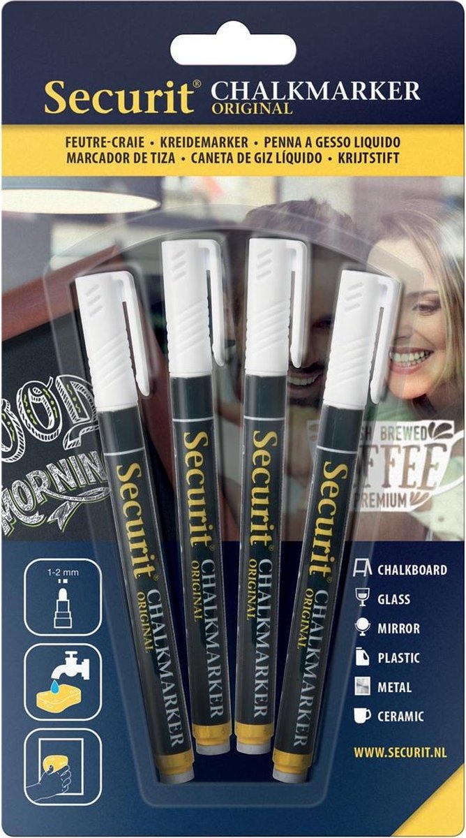 Fijne punt met schrijfbreedte 1-2 mm. Deze krijtmarker loopt niet uit, verkleurt niet en is bestand tegen lichte regen. Verwijderbaar met een spons en water.\\n\\nblister met 4 stuks: wit