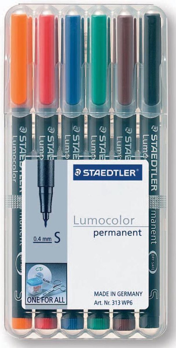 Watervaste stiften voor o.a. retroprojectie. De inkt is ontworpen om op nagenoeg alle gladde oppervlakken te schrijven: plastic, glas, porselein, diepvrieszakjes, OHP-transparanten, CD's/DVD's, enz.'Dry safe ink' technologie: kan tot 2 weken openliggen zonder uit te drogen.\\n\\ngeassorteerde kleuren, box met 6 stuks, superfijn 0,4 mm