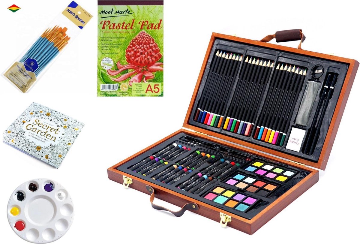 Houd jij ook zo van tekenen om helemaal tot rust te komen of heb jij kinderen die het geweldig vinden? Dan biedt deze tekenset met kleurboek, schetsboek, kwasten en mengpalet de ideale oplossing. Een zeer uitgebreide tekenkoffer met potloden, stiften, kwasten en verf laten jouw creativiteit naar boven komen. En die creativiteit kun je meteen uiten in het kleurboek en schetsboek dat je erbij krijgt. Weet jij al wat je gaat maken? Zeer uitgebreide tekenset In de houten tekenkoffer krijg je een uitgebreide en complete tekenset, waarmee je over een mooie basis tekenspullen beschikt. Met de onderdelen zoals kleurpotloden of waterverf kun je verschillende texturen uitproberen en zo verschillende kunstwerken maken. De tekenset bestaat uit de volgende onderdelen : ? Kleurpotloden 24x ? Waterverf 24x ? Oliepastels 24x ? HB potloden 2x ? Verfkwastjes 2x ? Puntenslijper 1x ? Gum 1x ? Schuurpapiertje 1x Sterke koffer met milieuvriendelijke onderdelen De koffer is erg overzichtelijk en zorgt