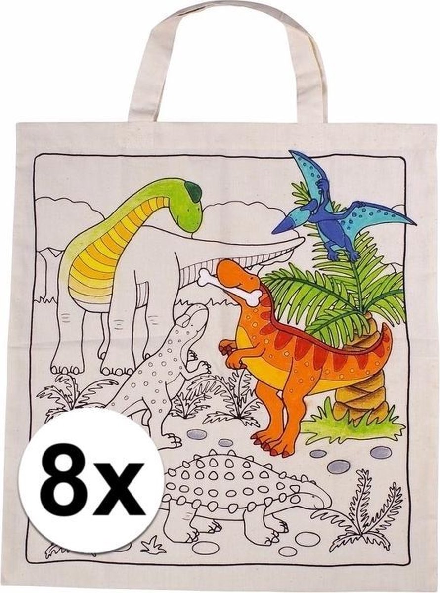 8 stuks inkleurbaar tasjes met dinosaurus motief. Een tas met dinosaurus motief welke ingekleurd kan worden met bijvoorbeeld waskrijtjes. Materiaal: Fairtrade gecertificeerd katoen. Afmetingen: ongeveer 38 x 42 cm.