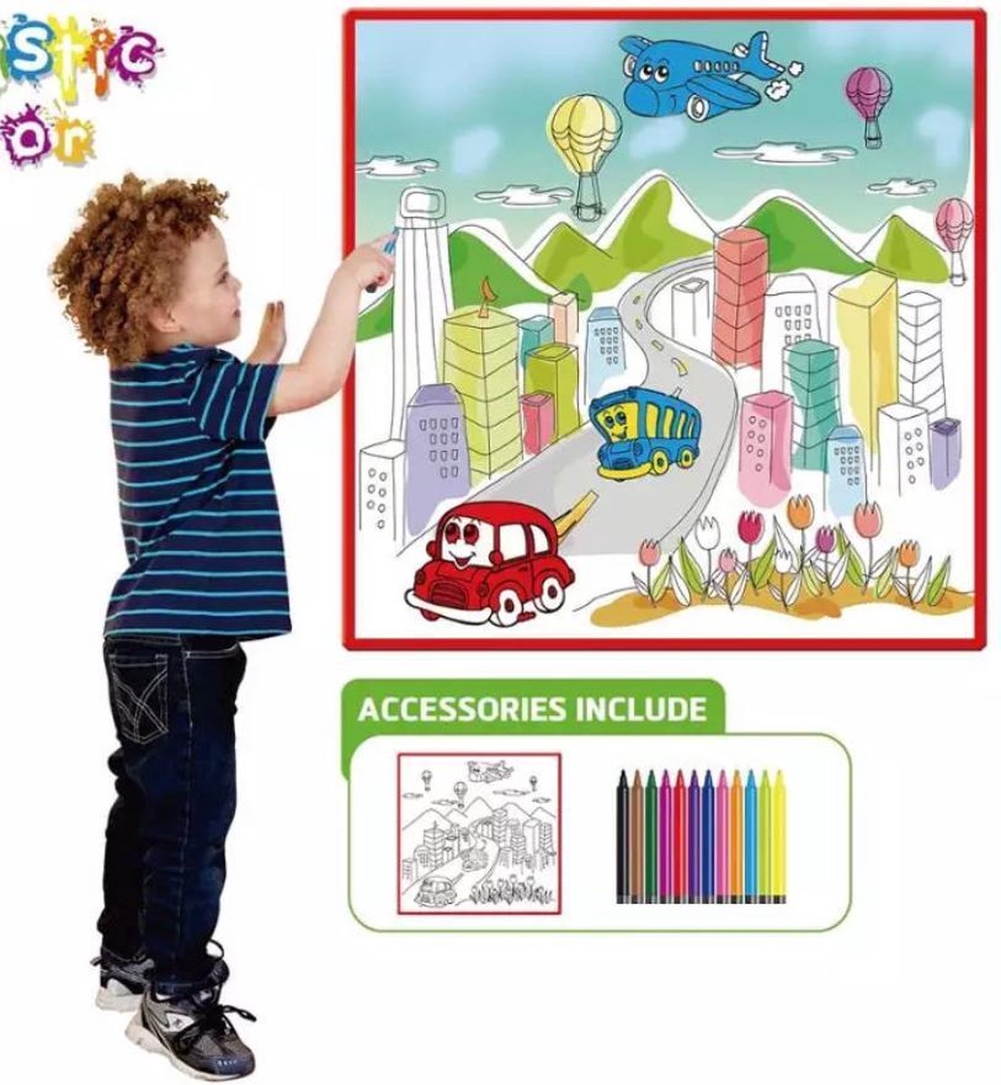 Eindeloos kleurplezier met dit tekendoek! Bijgeleverd zitten 12 verschillende kleuren stiften. Klaar met kleuren? Hang het doek op als een schilderij of verwijder met een natte doek de tekening die je net hebt ingekleurd en begin opnieuw met kleuren.