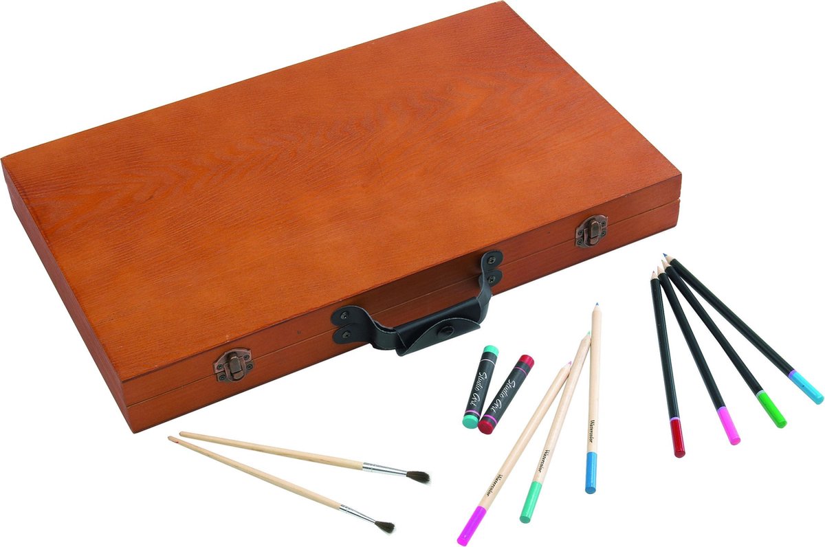 Zeer uitgebreide tekenset in mooie houten koffer. Met deze 88-delige tekenset komt al je creativiteit tot leven! Inclusief: 24 kleurpotloden 18 watercolor potloden 2 potloden HB 2 potloden 2B 30 wasco krijtjes 1 dubbele puntenslijper (voor normale en extra dikke potloden) 2 gummen 1 sponsje 24 kleuren waterverf 3 penselen 1 liniaal 1 nietmachine Voor vele uren creativiteit en plezier! De afmetingen van deze tekenkoffer zijn: 43,5 x 26,5 x 5 cm