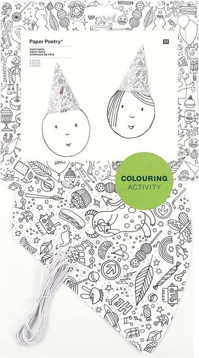 Een pak met 8 papieren feesthoedjes/partyhoedjes (250 grams), om zelf in te kleuren. Opdrukken van o.a. insecten, aliens en snoepjes. De afbeeldingen varieren van 1 tot 5 cm. Afmeting hoedje: D13 x H20 cm. Leuk om kinderen mee te laten knutselen op een kinderfeestje/verjaardagspartijtje! Hobbymateriaal/knutselmateriaal diy feesthoedjes/partyhoedjes kleuren voor kinderen/jongens/meisjes.