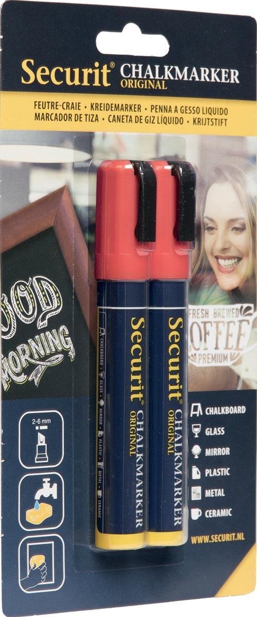 Securit originele krijtmarker met medium schuine punt van 2-6 mm. Deze krijtmarker loopt niet uit, verkleurt niet en is bestand tegen lichte regen. Te gebruiken op alle niet-poreuze oppervlakken. Afwasbaar met spons en water.\\n\\nrood, blister met 2 stuks
