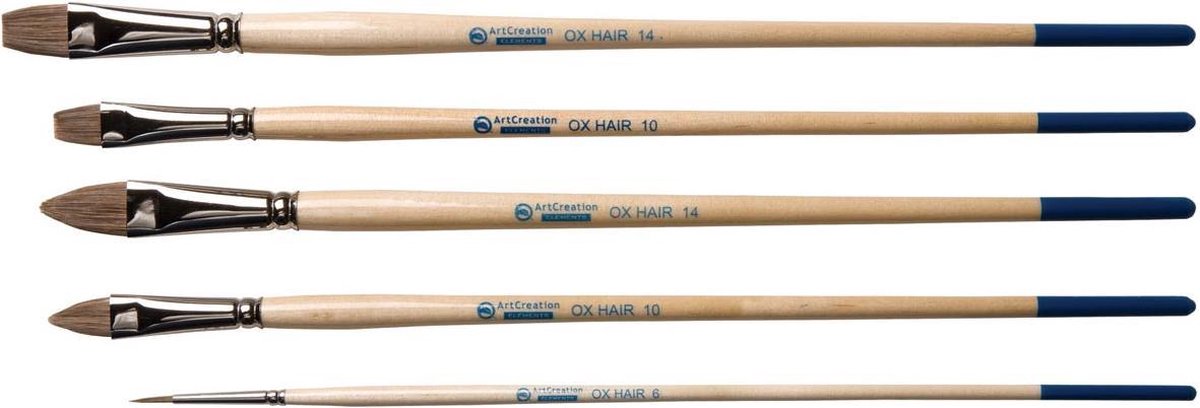 Uit runderorenhaar. Voor olieverf, acrylverf en plakkaatverf.\\n\\nset van 5 stuks: 1 x rond nr 6, 2 x kattentong nr 10 en 14, 2 x plat nr 10 en 14