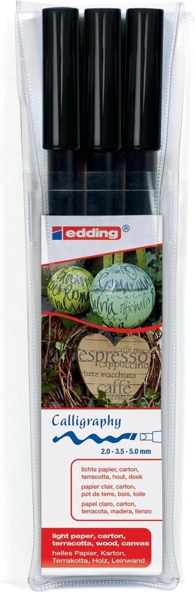 Viltstift met kalligrafiepunt. Gepigmenteerde, permanente, zeer lichtbestendige inkt op waterbasis. Watervast op bijna alle oppervlakken.\\n\\netui van 3 stiften in geassorteerde schrijfbreedtes