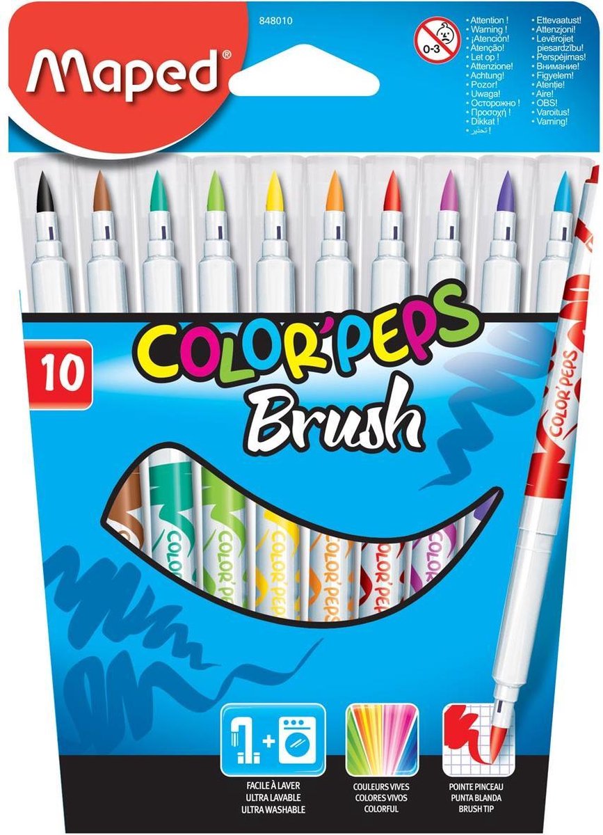 Heldere, geassorteerde kleuren. Ultra-uitwasbaar. Soepele penseelpunt met diameter van 2,8 mm. Ideaal voor schetsen, tekeningen, illustraties, enz. 10 stiften in een kartonnen etui.