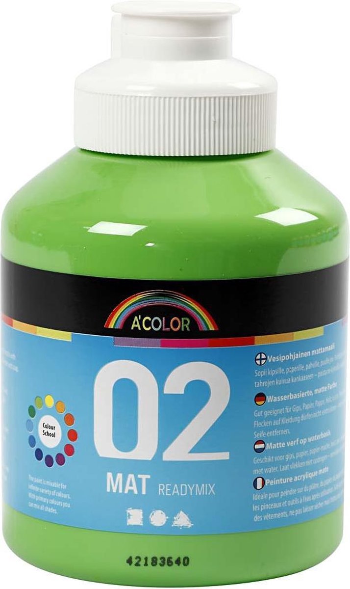 A-Color acrylverf (500 ml) Hoge kwaliteit dekkende allround acrylverf op waterbasis - droogt mat op - geschikt voor papier, hout, canvas etc. Kan onderling worden gemengd. Kwasten schoonmaken met lauw water.