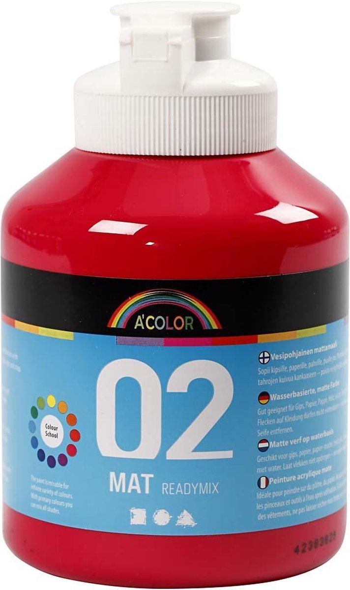 A-Color acrylverf (500 ml) Hoge kwaliteit dekkende allround acrylverf op waterbasis - droogt mat op - geschikt voor karton, hout, canvas etc. Kan onderling worden gemengd. Kwasten schoonmaken met lauw water.