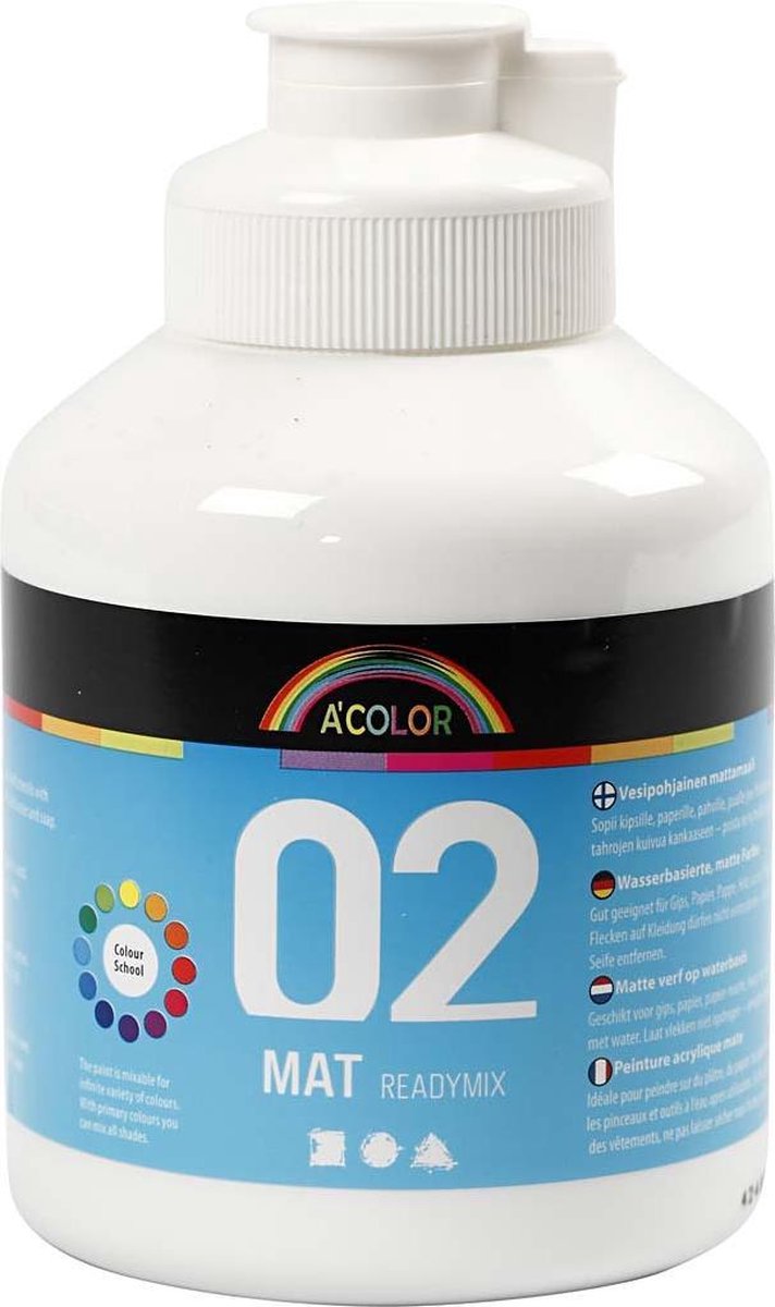 A-Color acrylverf (500 ml) Hoge kwaliteit dekkende allround acrylverf op waterbasis - droogt mat op - geschikt voor karton, hout, canvas etc. Kan onderling worden gemengd. Kwasten schoonmaken met lauw water.