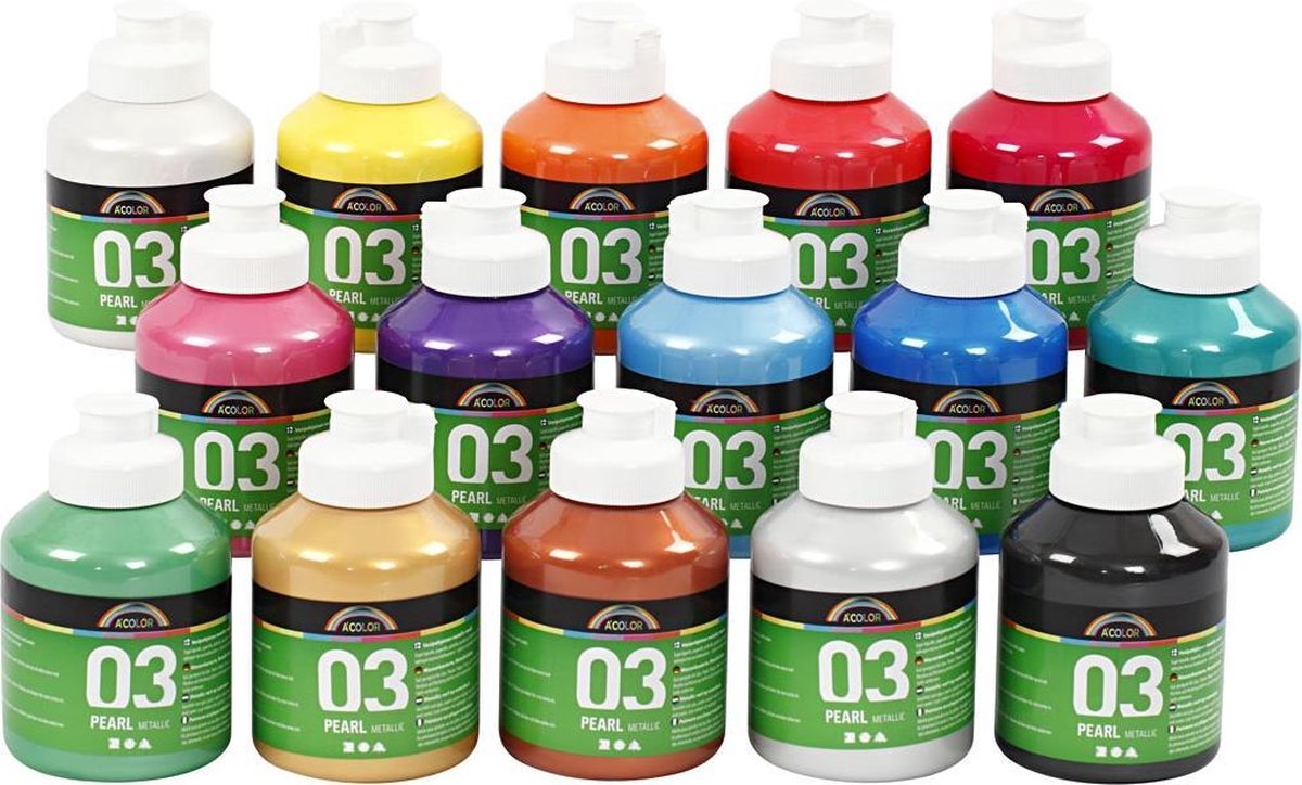 Mooie kwaliteit glanzende acrylverf op waterbasis. Kleuren kunnen gemengd worden. Kwasten schoonmaken in lauw water Assortiment bevat 15 kleuren van elk 500 ml