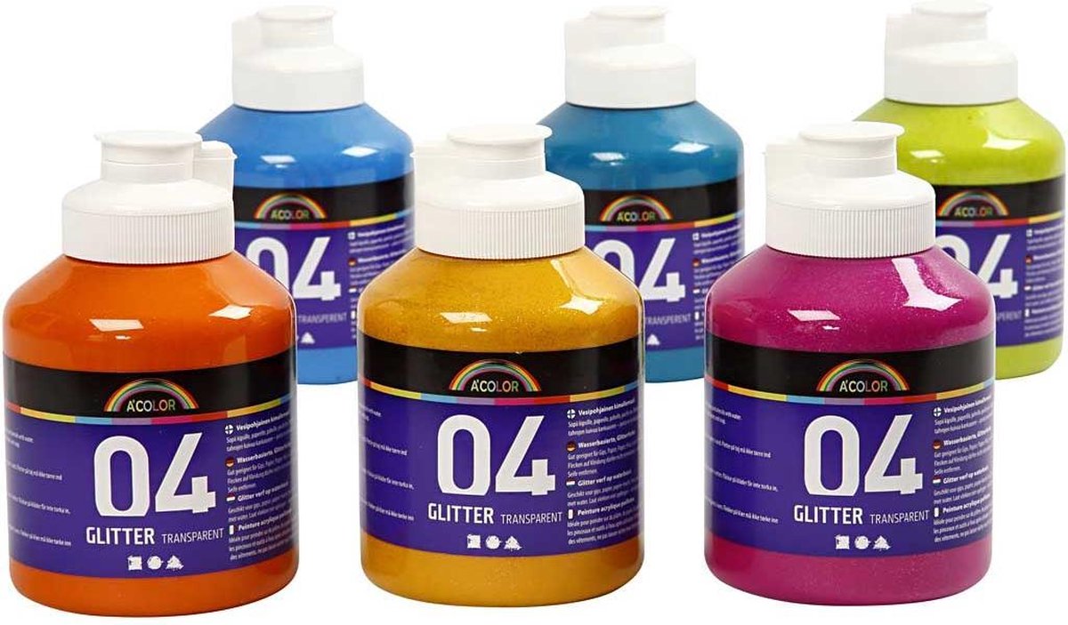 Mooie kwaliteit glanzende acrylverf op waterbasis. Kleuren kunnen gemengd worden. Kwasten schoonmaken in handwarm water Assortiment bevat 6 kleuren van elk 500 ml
