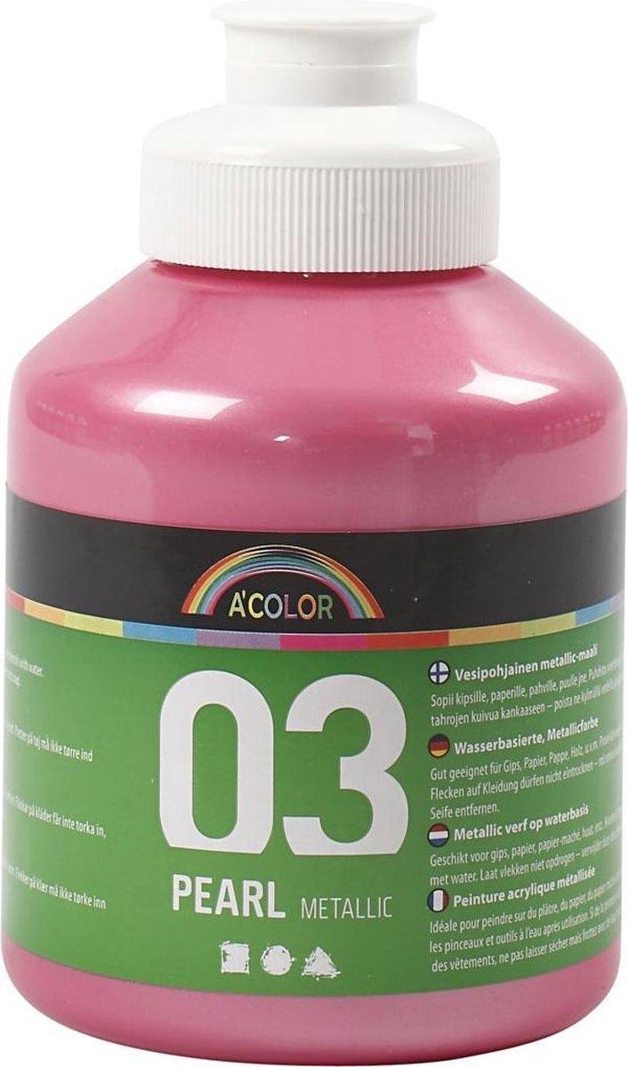 A-Color acrylverf (500 ml) Mooie kwaliteit metallic verf op waterbasis - prachtige glanzende kleuren - geschikt voor bijna elk vetvrij oppervlak. Kan onderling worden gemengd. Kwasten schoonmaken met lauw water.
