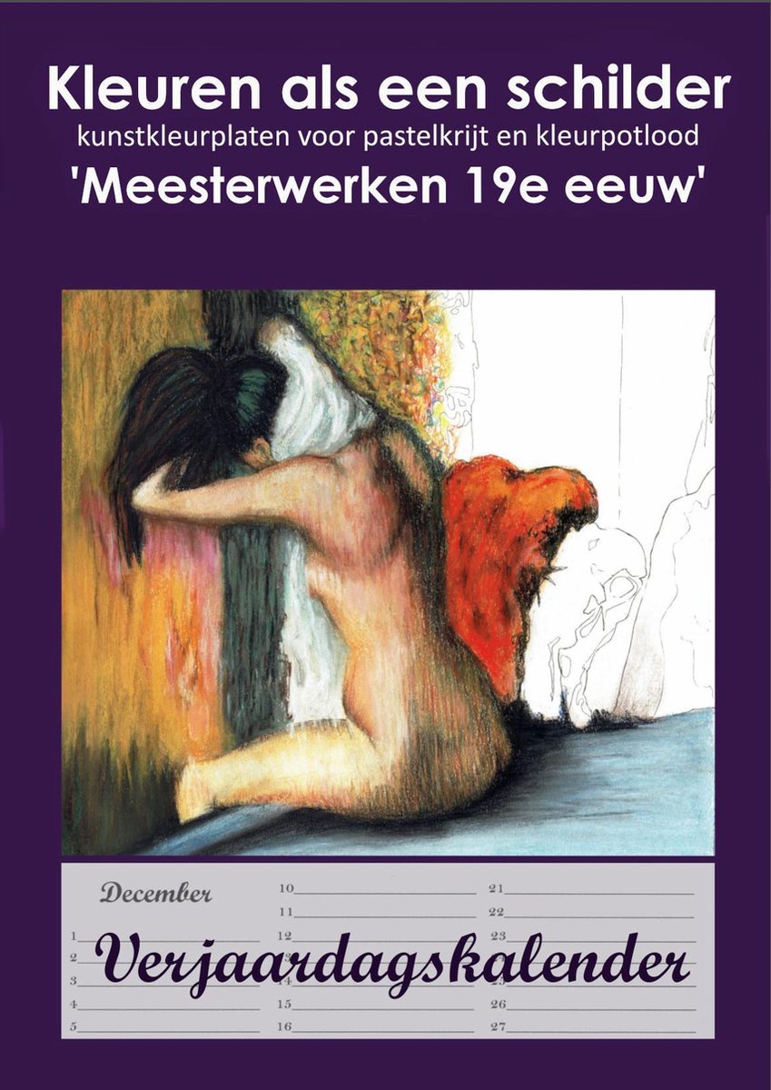 A3 kleurboek voor volwassenen, in de vorm van een verjaardagskalender, geschikt voor kleurpotlood, pastelkrijt, aquarel en waterverf. De kalender is met wire-o binding en een haakje. De kleurkalender bestaat uit: twaalf met de hand uitgewerkte tekeningen van beroemde meesterwerken uit de 19e eeuw (o.a: van Gogh, Israels, Klimt e.a.) De twaalf kleurplaten zijn de twaalf maanden van het jaar, met daaronder de regels voor het noteren van verjaardagen. Twee pagina's voorbeeldplaten met een begeleidende tekst over het kunstwerk en de kunstenaar. een pagina met informatie over kleurtheorie en materiaalgebruik; met uitgebreidere informatie en stap-voor-stap- handleidingen te vinden op Tekenatelier-sigrid. Hahnemühle aquarelpapier 150 grams . Het papier is geschikt voor zowel kleurpotlood, aquarelpotlood, aquarelverf en waterverf. De kleurkalender wordt volledig handmatig geproduceerd in Almere!