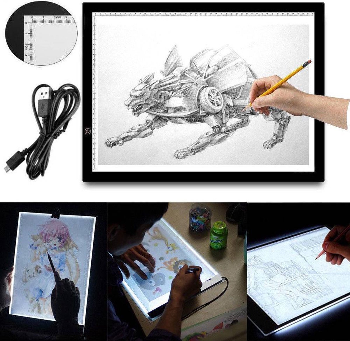 Compact en elegant ontwerp Met een speciaal acryl oppervlak, wat voelt als een paneelglas, maar veel sterker is dan glas. Deze LED-lichtbak wordt geleverd met zeer heldere LED-lampen, die door heel dik papier kunnen schijnen. Ideaal te gebruiken tijdens schetsen, tekenen, kalligraferen en tatoeage oefeningen. Deze lichtbak werkt zonder software, u hoeft alleen de stekker in te steken en vervolgens de lichtbak aanzetten om uw creatieve werk te starten. Specificaties: Materiaal: Acryl en PVC Kleur: zwart en wit Voltage: 5V DC 2A Kleurtemperatuur: 12000K Lichtbron: LED- strip Nominaal vermogen: 11W LED-hoeveelheid: 90 Grootte: 470 x 345 x 5mm (L x B x H) Verlicht gebied: 410 x 290 mm Let op: Wees voorzichtig, gebruik geen scherpe metalen voorwerpen (tegen krassen op het werkoppervlak). Bewaar na gebruik altijd op een veilige, droge plaats. Levering: 1 x LED-tekenbord in A3 formaat 1 x USB-kabel (werkt met elke stekker met USB ingang zoals telefoonopladers)