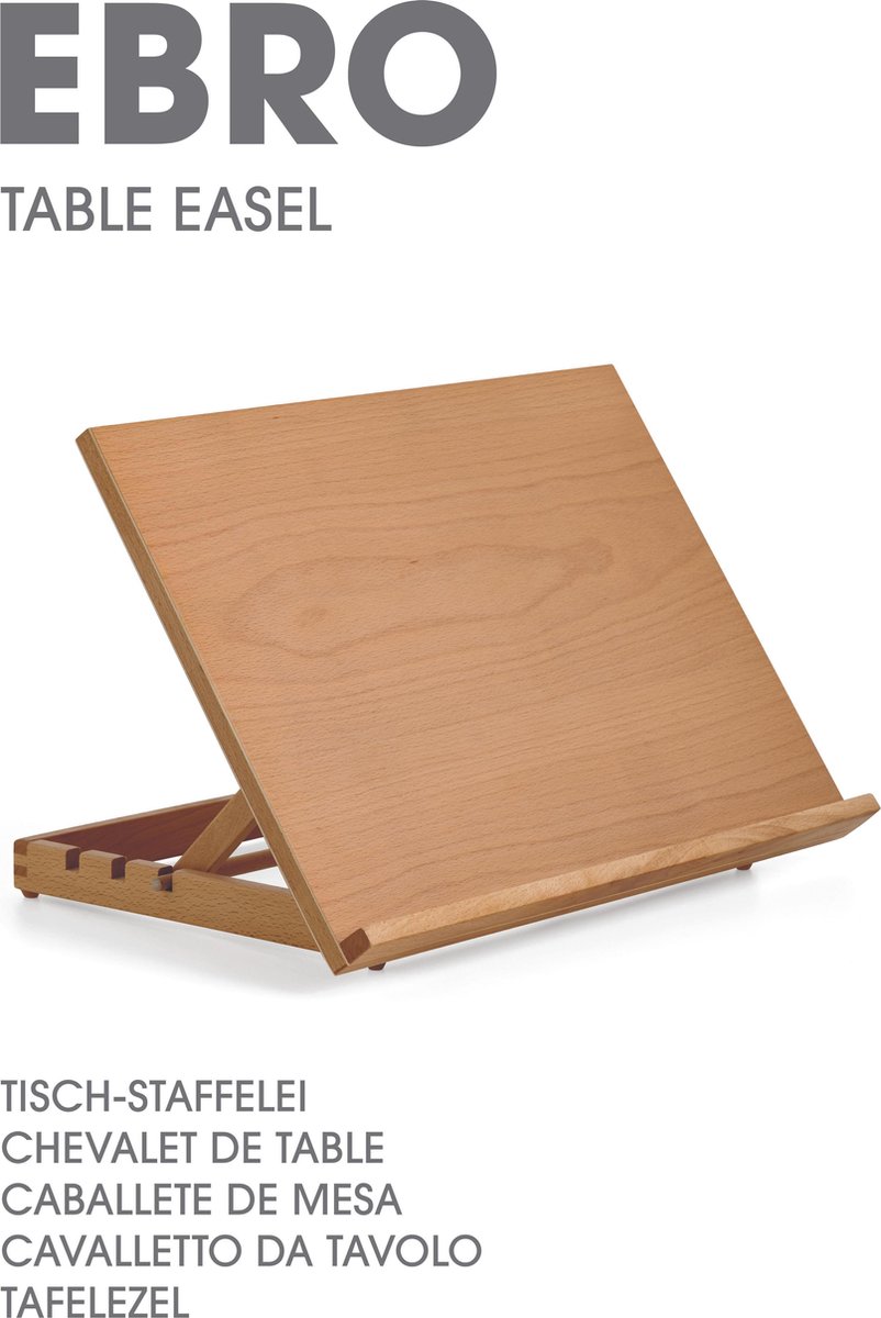 "Een schildersezel maakt het mogelijk om een doek in verticale positie neer te zetten zodat je makkelijk aan een schilderij kunt werken. Schildersezels zijn beschikbaar in allerlei vormen en maten. Als je op een vaste locatie schildert is een zogenaamd atelierezel of studio-ezel het meest geschikt. Deze ezels zijn zwaarder en op diverse hoogtes en in verschillende hoeken in te stellen. Wil je je ezel makkelijk kunnen verplaatsen of zelfs buiten schilderen, dan is een veldezel ideaal. Een tafelezel is geschikt voor kleinere doeken. 'Ebro' is een perfecte tafelezel om gemakkelijk aan tafel te kunnen tekenen en schilderen. Dit stevige workstation is gemaakt van hard beukenhout en kun je op 3 verschillende standen instellen. Zo creëer je de optimale werkpositie en voorkom je dat je rug wordt belast. Ideaal voor iedereen die graag langere tijd geconcentreerd wil kunnen werken. Geschikt voor doeken met een maximale hoogte van 32 cm. "