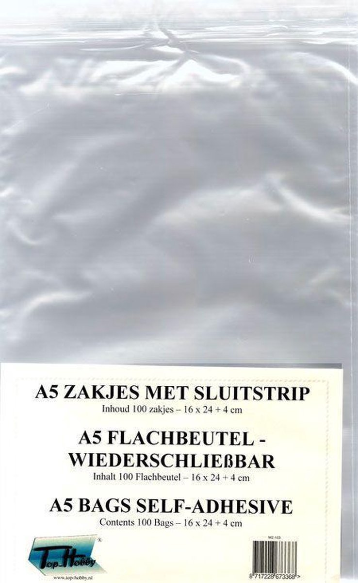 A5 Formaat Zakjes Met klep en hersluitbare kleefstrip Formaat: 16 x 22 + 3cm Dikte: 30 Micron Inhoud: 300 Zakken Vlakke polyprolyleen zakjes Zuurvrij Geschikt voor A5 formaat papier, karton en heel veel ander materiaal.