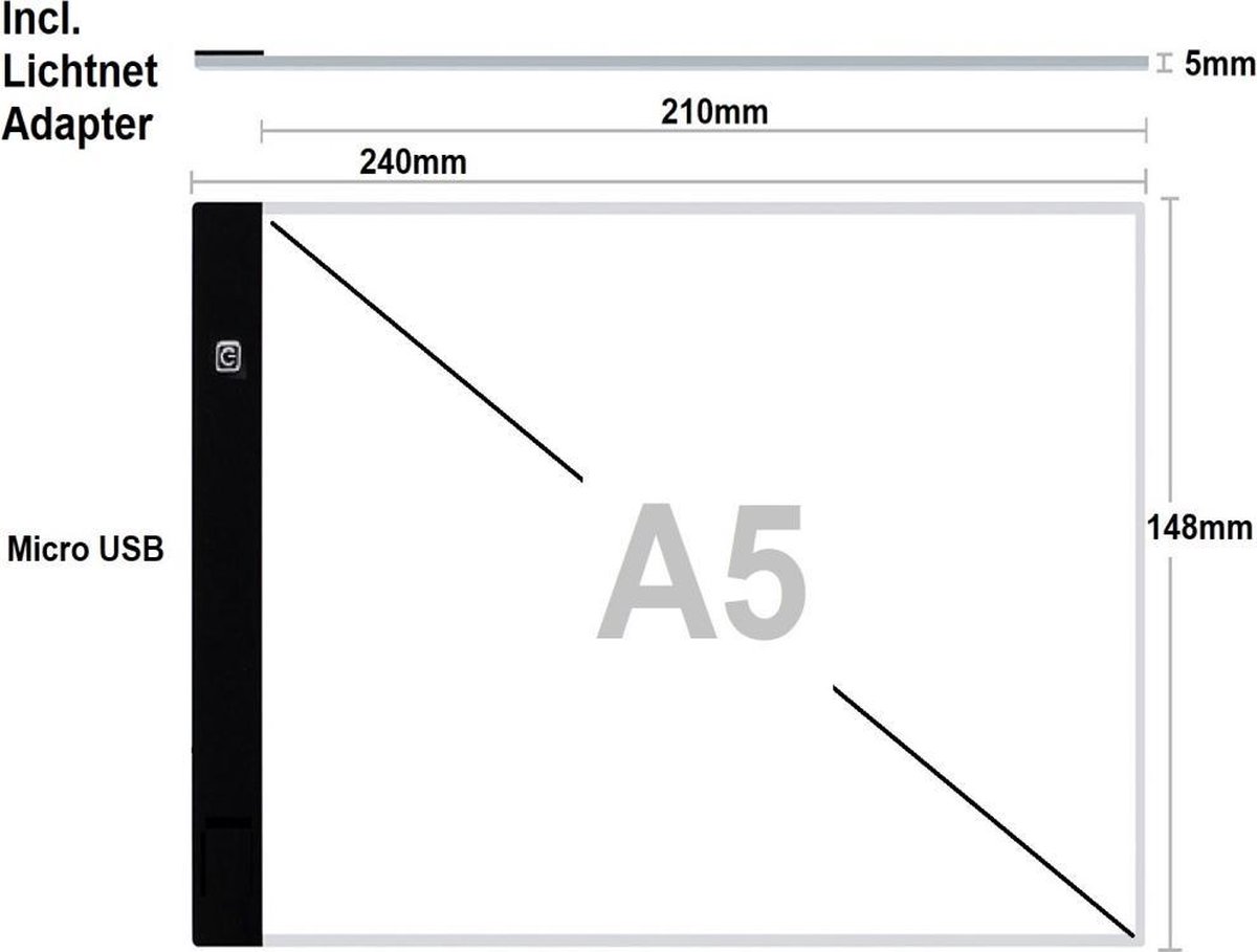 ? Nieuw traploos Dimbaar Model A5 met EU Adapter: - Dunner in hoogte - Hoge lichtopbrengst - Lichter in gewicht EenLightPad model A5 is ideaal voor onder je hobbywerkstuk, zoals canvassen voor Diamond Painting, tekenpapier en kopieerwerk. Aan te sluiten via de meegeleverde USB-kabel op uw computer, laptop, powerbank of met demeegeleverde adapter op het lichnet. Formaat : A5 Lichtbak / Tekentafel LED verlichting, lamp gaat +/- 50.000 uur mee Geen schroeven op de plaat Licht standen traploos aan te passen aan je behoefte Touchscreen Aan/Uit knop Inclusief 2 in 1 USB adapter en USB kabel Afmetingen geheel: 24cm x 14.8cm Afmetingen lichtgedeelte: 21cm x 14.8cm Hoogte: 0.5cm Deze lichtbak wordt vaak gebruikt door: Tattoo , Tekenaars , Architecten , Kaartenmakers , Quilten en hobbyisten voor o.a. Diamond Painting. Verkrijgbaar in A2, A3, A4 en A5 formaat.