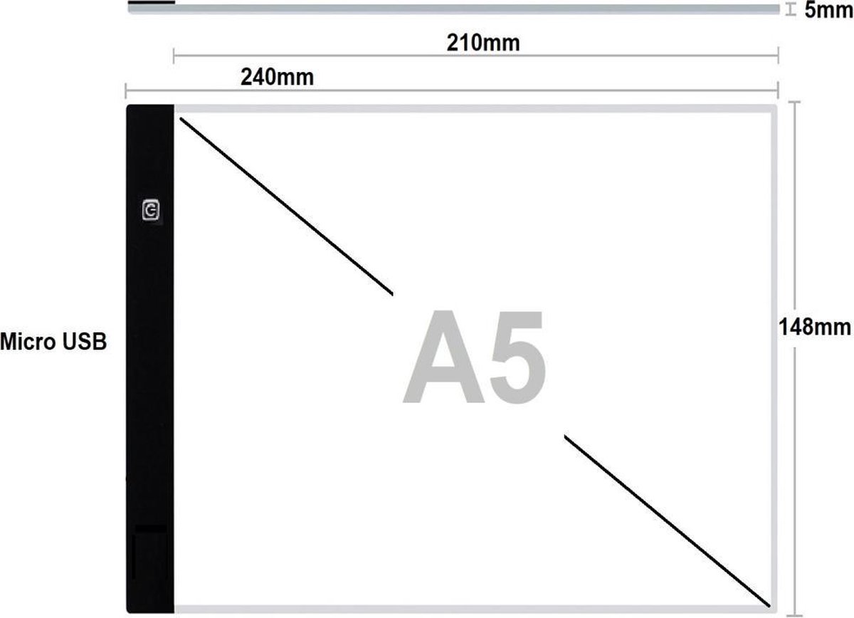 Lightpad A5 voor o.a. Diamond Painting. Nieuwhandzaam instapmodelModel A5: - Dunner in hoogte - Hoge lichtopbrengst - Lichter in gewicht EenLightPad model A5 is ideaal voor onder je hobbywerkstuk, zoals canvassen voor Diamond Painting, tekenpapier en kopieerwerk. Aan te sluiten via de meegeleverde USB-kabel op je computer, laptop, powerbank of met de oplader van je telefoon op het lichnet. Formaat : A5 Lichtbak / Tekentafel LED verlichting, lamp gaat +/- 50.000 uur mee Geen schroeven op de plaat Touchscreen Aan/Uit knop Afmetingen geheel: 24cm x 14.8cm Afmetingen lichtgedeelte: 21cm x 14.8cm Hoogte: 0.5cm Deze lichtbak wordt vaak gebruikt door: Tattoo , Tekenaars , Architecten , Kaartenmakers , Quilten en hobbyisten voor o.a. Diamond Painting. Verkrijgbaar in A2, A3, A4 en A5 formaat.