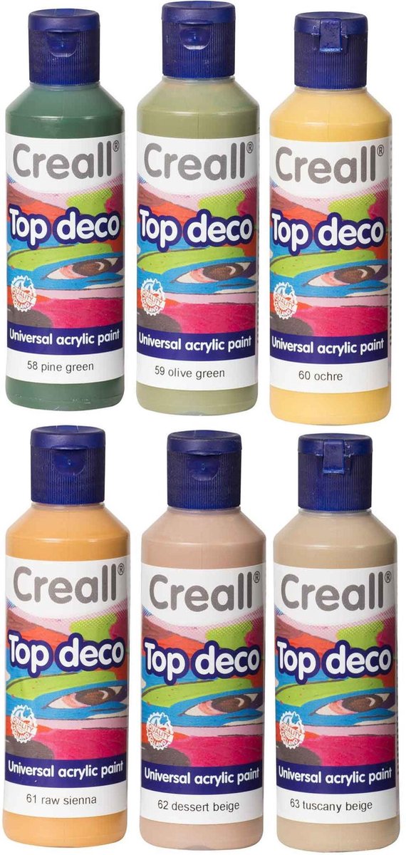 Top Deco Acryl Verf Set van 6 Kleuren. 6x 80ml, dus 480ml super dekkende acrylverf voor een leuk prijsje Deze set bevat de kleuren: 915-58 Pine Green, 915-59 Olive Green, 915-60 Ochre, 915-61 Raw Sienna, 915-62 Dessert Beige, 915-63 Toscany Beige - Acrylverf met kunstschilderskwaliteit: Zeer grote pigmentdichtheid en hoge licht-echtheid. Lekker makkelijk! Geen geklieder met terpentijn, snel droog en niet duur De verf is oplosbaar in water en hecht op vrijwel iedere vetvrije ondergrond. creall-acryl heeft een goede filmvorming en droogt watervast op. Een extra voordeel van Creall-acryl is dat deze verf een iets langere droogtijd kent dan de meeste andere acrylverven. U hoeft zo niets toe te voegen om de droogtijd te verlengen. Let er bij de verwerking van de verf op dat de temperatuur niet onder de 10°C komt en gebruik liefst nylon - of goedkopere penselen, aangezien acrylverf het natuurlijke vet in dierlijk haar (marter bijvoorbeeld) oplost. En dat zou zonde zijn , nietwaar?