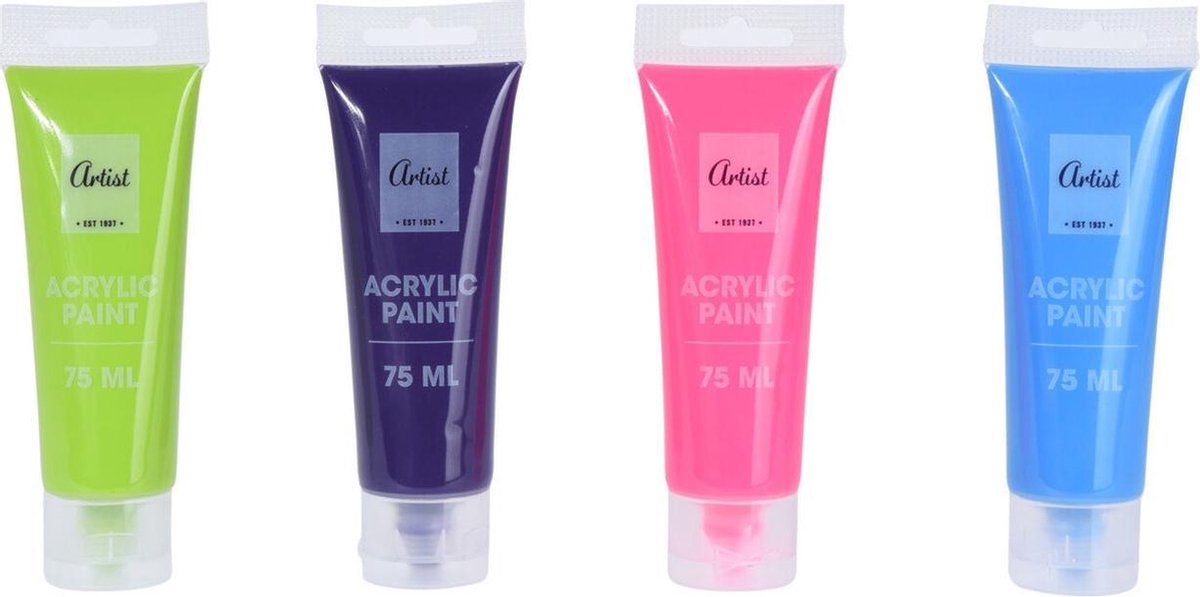 Acryl verf setje van 4 tubes in de kleuren groen, paars, roze en blauw. U kunt de verf verdunnen met water of met elkaar mengen om zo prachtige creaties te verven/schilderen! Inhoud per tube: 75 ml. Merk: Artist. Hobbymateriaal/knutselmateriaal acryl verf op waterbasis. Schilder benodigdheden. Verf voor jongens/meisjes/kinderen/volwassenen om mee te knutselen/schilderen. Creatief speelgoed voor kleine kunstenaars.