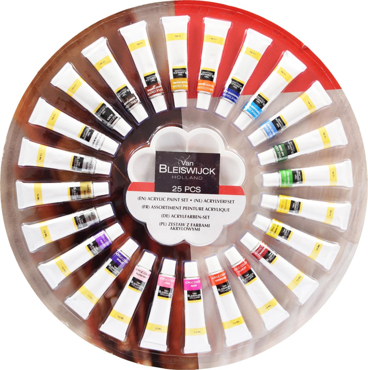 Praktische set met 24 tubes 12 ml acrylverf en schilderspalet. Je kan de kleuren puur gebruiken, maar het is ook mogelijk de kleuren onderling te mengen. ? Voor uren lang schilderplezier! ? Te gebruiken op verschillende oppervlaktes ? Deze verf kan vlekken maken op textiel, deze vlekken zijn niet uitwisbaar!