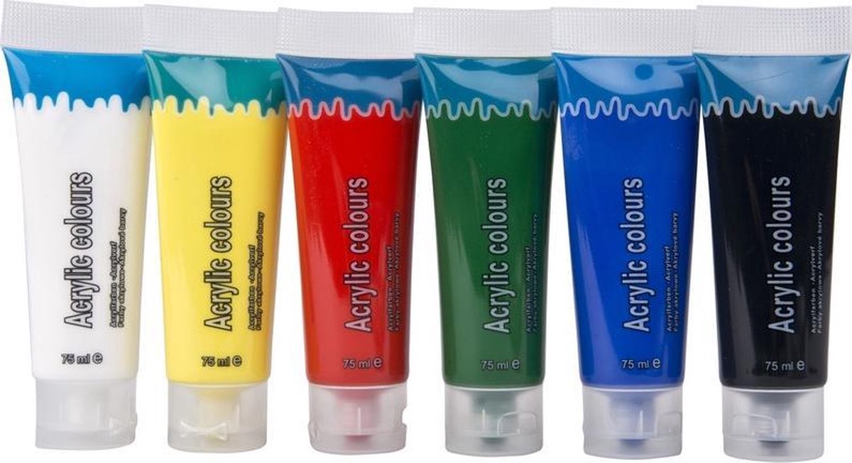 Acrylverf in 6 kleuren 75 ml hobby/knutsel. 6 Verschillende kleuren acrylverf, in tubes met een inhoud van 75 ml. U ontvangt de kleuren wit, geel, rood, groen, blauw en zwart. Acrylverf heeft een korte droogtijd en is geschikt voor o.a. papier, canvas, hout en aardewerk. Het verf is op waterbasis, maar na droging watervast. Hobby/knutselmateriaal schilderen met acrylverf, 6 tubes.