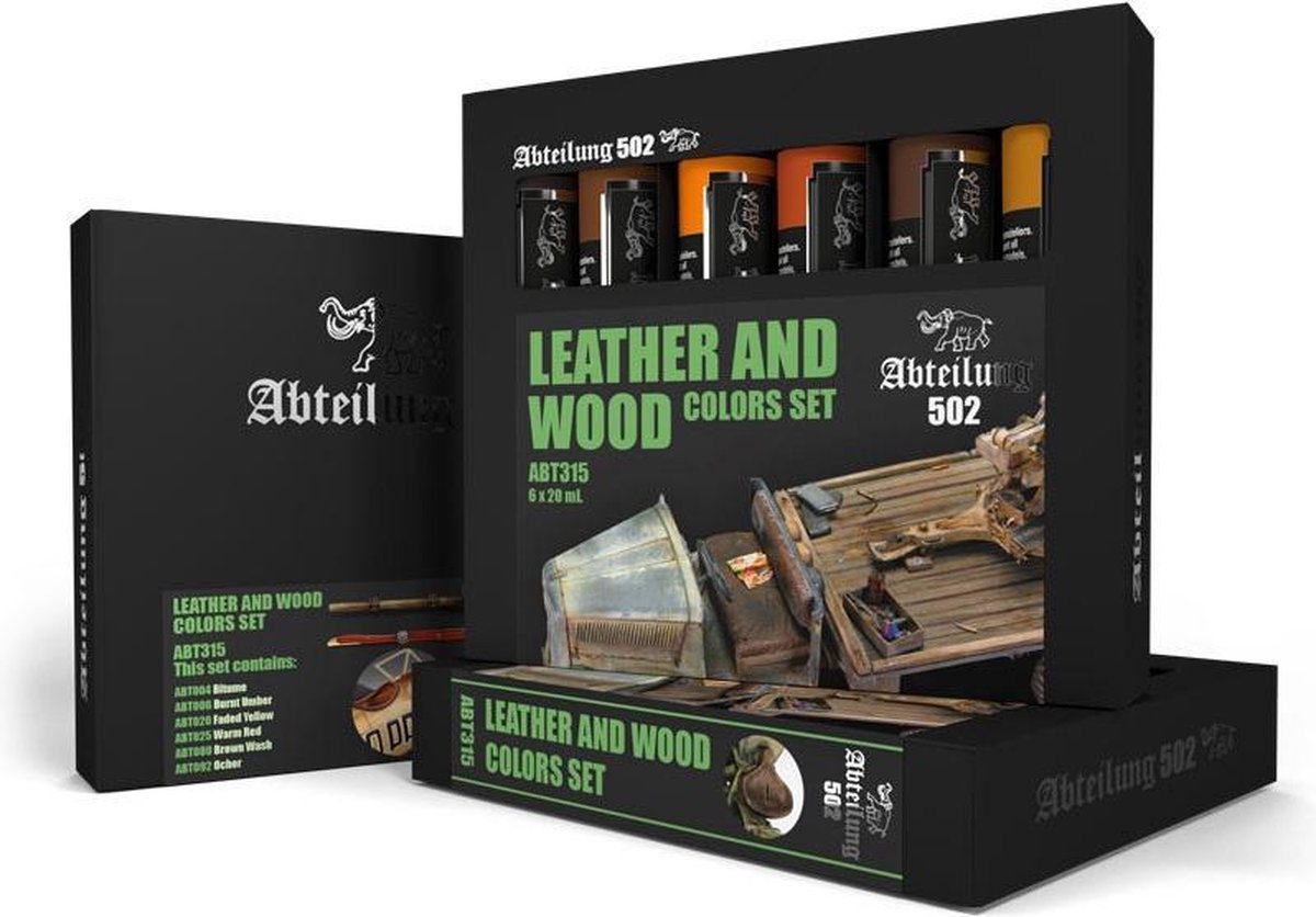 In deze set vindt u alle basiskleuren om verschillende leer- en houttinten te schilderen. Dit zijn allemaal warme kleuren die bij menging bijna elke leer en houttoon kunnen bereiken, plus de schaduw- en lichtvlakken. Al deze oliën hebben de bekende uitstekende kwaliteit. Deze set bevat de volgende kleuren: ABT004 Bitume, ABT006 Burnt Umber, ABT020 Faded Yellow, ABT025 Warm Red, ABT080 Brown Wash, ABT092 Ocher