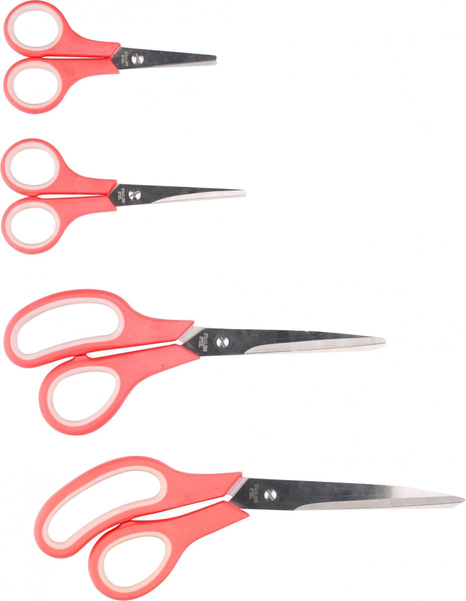 Alpina scharenset Voor iedere klus een schaar. Een complete scharenset met vier scharen in verschillende maten. Specificatie: Geslacht: junior, unisex Kleur: rood, zilver Materiaal: kunststof, RVS Maten: 12-14-21-25 cm Leeftijd: vanaf 6 jaar Inhoud: 4 Scharen