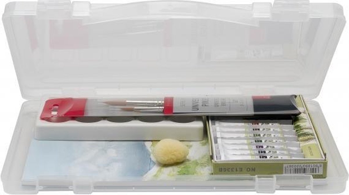 Complete aquarelverf set met kunststof koffer Aquarelverf set in transparante box van kunststof met handvat en 2 sluitingen. Deze 8-delige set bevat: 4 Universele penselen, Serie A 140: telkens 1x Gr. 0, 2, 6, 12. 1 Kunststof palet met 10 napjes. 1x Aquarelblok No., 200g/m2 . 24x32cm 1 set Marie's Aquarelverf, 12 kleuren à 12ml 1x Aquarelspons