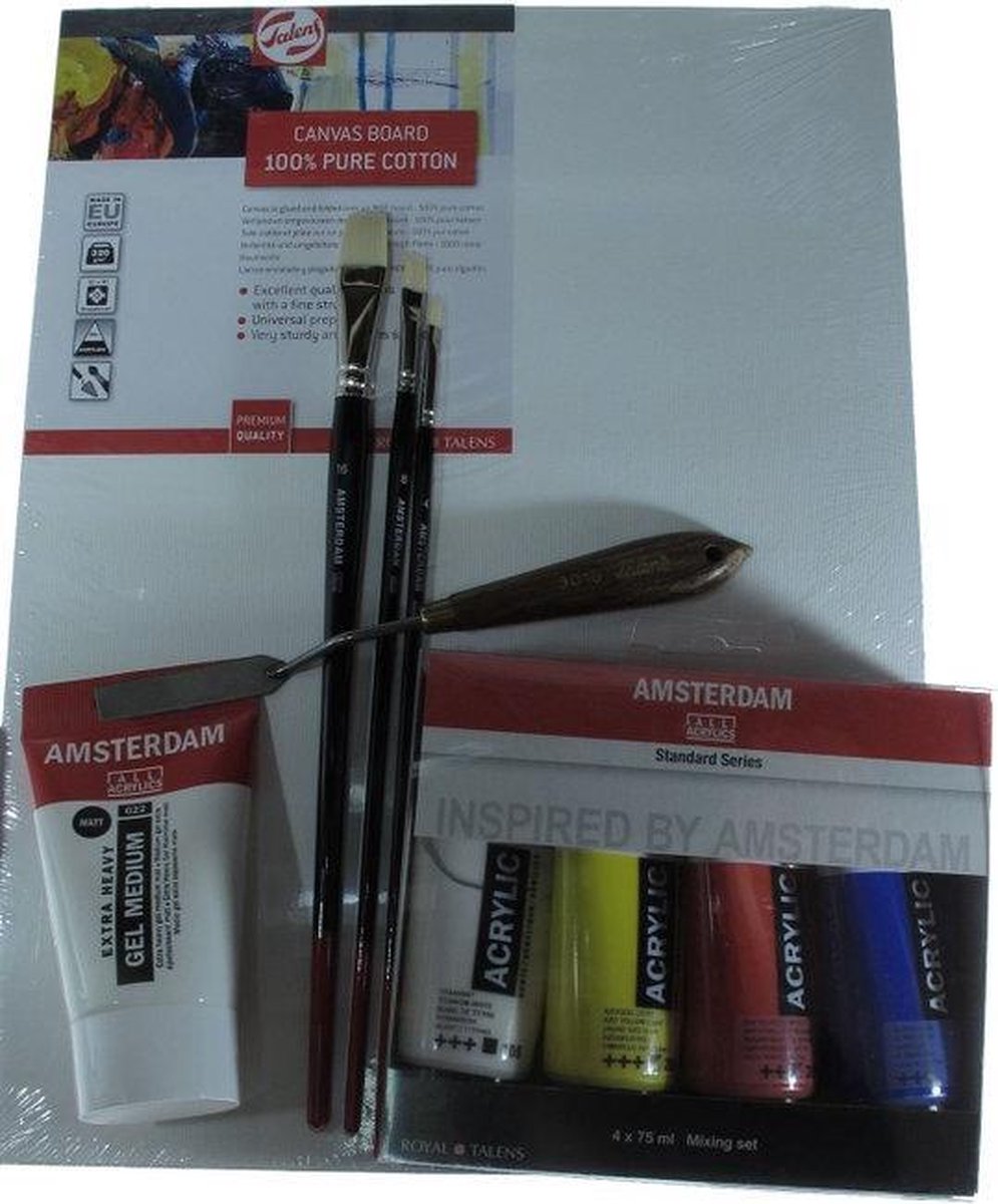 Value-pack met 4 tubes van elk 75ml Amsterdam Acryl Standard Series in de kleuren: azogeel licht (268) naftolrood middel (396), ultramrijn (504) titaanwit (105)