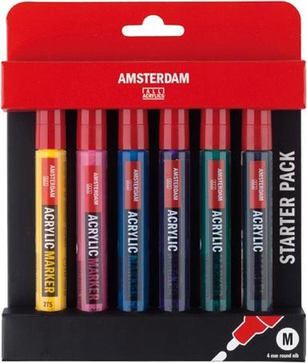 Set met zes Amsterdam markers in briljante kleuren met een punt van 4 mm dikte. De punt is omkeerbaar en vervangbaar. Net als bij Amsterdam acrylverf zijn er (half)dekkende en (half)transparante kleuren. De markers zijn op waterbasis, maar na droging watervast. Ze zijn geurloos en je kunt ze perfect combineren met andere producten van Amsterdam. De markers zijn ideaal voor het aanbrengen van contouren en prachtige lijntekeningen. Goed schudden (met de dop erop en de punt omhoog), even pompen en je kunt meteen aan de slag op verschillende ondergronden. Na afloop kun je de markers het beste liggend bewaren. Inhoud: - 6 markers 4 mm: Primairgeel, Quinacridonerose, Briljantblauw, Ultramarijnviolet, Geelgroen en Oxydzwart.