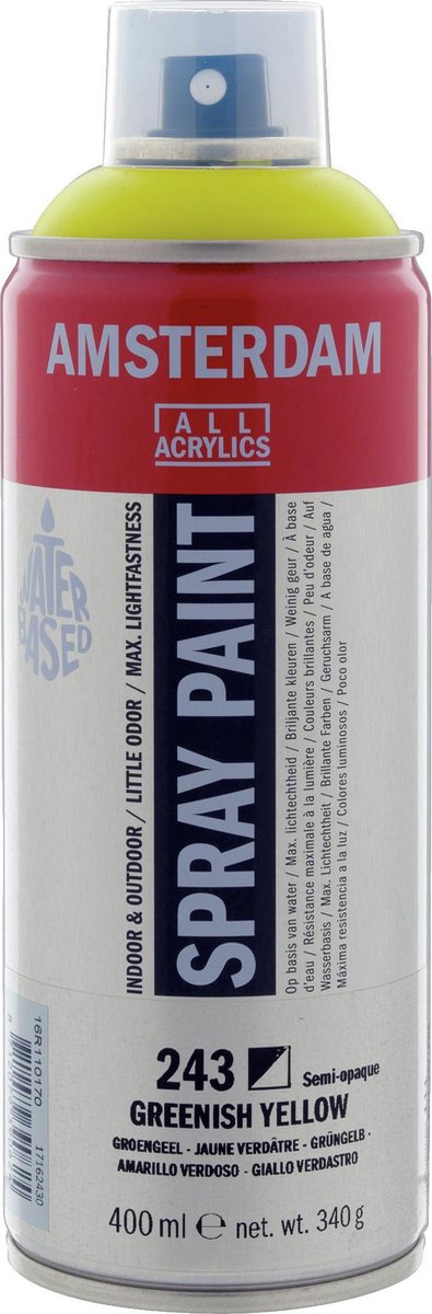 Verf op waterbasis, vrijwel geurloos. Zowel voor binnen- als buitengebruik, te gebruiken op verschillende ondergronden. Geschikt voor decoratie van meubels, potten, kunstwerken, etc. Na droging watervast. Briljante kleuren, goede lichtechtheid. Verschillende spuitdiktes mogelijk dankzij verschillende caps. Spuitbus van 400 ml.