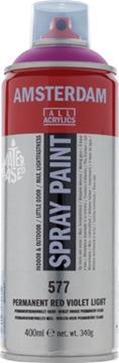 Verf op waterbasis vrijwel geurloos. Zowel voor binnen- als buitengebruik. Kan gemixt worden met Amsterdam verf en markers. Hoge lichtechtheidsgraad. Na droging watervast. Mix van dekkende en transparante kleuren. Spray van 400 ml.